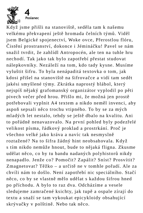 Text je prasáckým písmem, s velkým řádkovám prokladem a výrazným prostrkáním. Sám o sobě přiznává, že je to vlastně blábol a organizátoři potřebovali vyplnit A4 textem. Budeme zřejmě dělat něco, kde se budeme potřebovat strefit do určitých míst na papíře, i když to nebude úplně přesné. Kde je ale šifra? Jediné jasné vodítko k luštění je zmínka, že se s šifrou má udělat něco jednoduchého, co by se mělo udělat po příchodu s každou šifrou. Jestliže jsme to dosud neudělali, podíváme se proto konečně na druhou stranu.