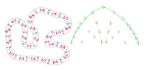 K čemu máme informaci (0,1)? Zlomky, které hledáme, budou zřejmě z tohoto intervalu. Teď se potřebujeme někde chytit. To jde naštěstí snadno. Jmenovatele zlomků známe, takže máme pro rozdíly víceméně vždy jen dvě symetrické možnosti typu 1/7 − 1/8 a 7/8 − 6/7. Zda se pohybujeme v oblasti velkých nebo malých čísel, odhadneme z koncentrace znamének okolo. Ještě chytřejší je všimnout si poloviny, která může být jen 1/2, a tudíž je jednoznačná. Pak už to jde snadno a dostaneme sekvenci zlomků, od nejvyššího bodu 7/8, 1/9, 2/3, 8/9, 2/3, 5/7, 1/9, 5/8, 5/7, 8/9, 2/7, 1/5, 2/3, 3/7, 5/9, 8/9, 4/7, 3/4, 1/6, 1/3, 1/2, 2/5, 8/9.