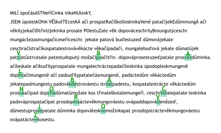 A taky jsou tam chyby. Každé písmeno se v textu vyskytuje několikrát, tudíž si můžeme být jisti jeho správným kódováním. Jenže občas je něco zapsáno úplně jinak (a způsobem, který ani nesplňuje uvedená pravidla). V přečtení textu to nicméně nebrání. Odchylky si vyznačíme, protože je jich tolik, že tam budou záměrně, a necháme na později.